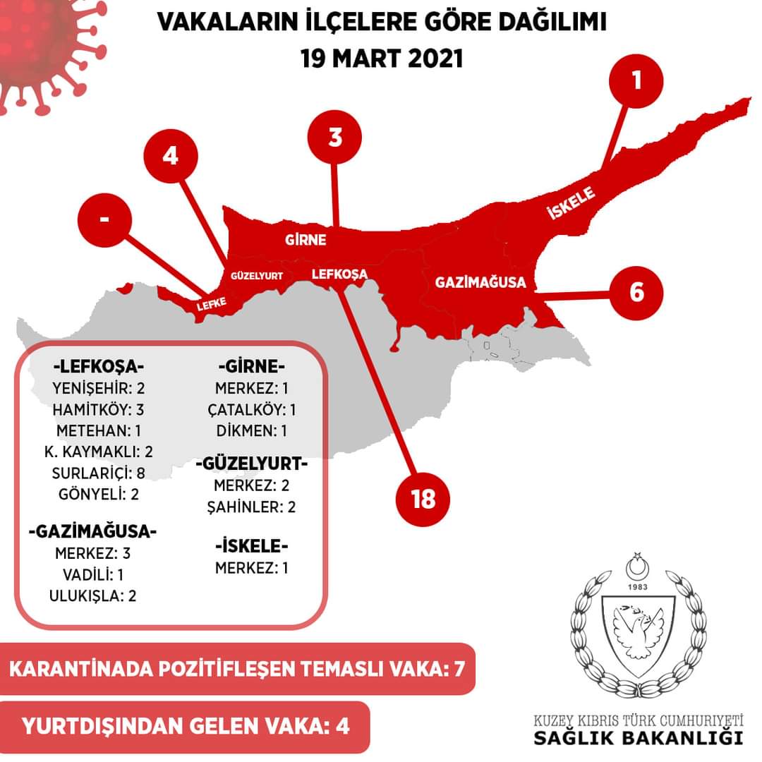 Sağlık Bakanlığı’ndan yapılan açıklamaya göre son 24 saatte yapılan test sayısı 6930 olup, 32′ si  yerel 43 pozitif vakaya rastlanmış, 29 kişi taburcu edilmiştir.
