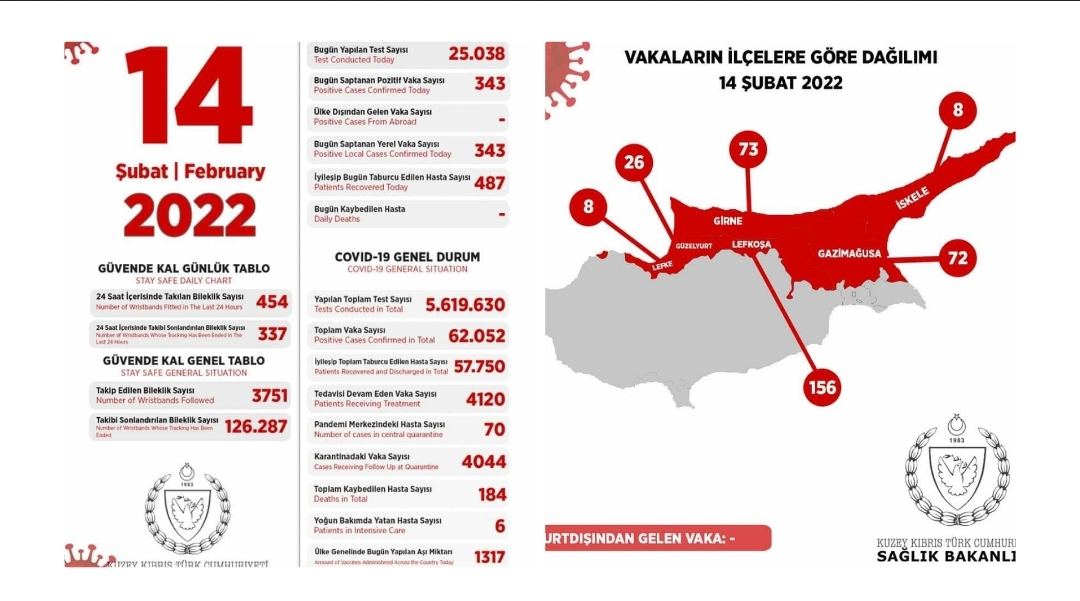 Τα 156 από τα τελευταία επιβεβαιωμένα κρούσματα είναι από την επαρχία Λεφκόσια, τα 73 από την Γκίρνε, τα 72 από την Γκαζίμαγουσα, τα 26 από την Γκιουζέλγιουρτ, τα 8 από την Ισκέλε και τα 8 από την Λέφκε.