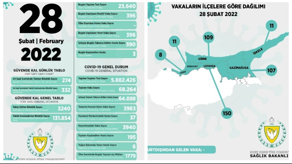KKTC‘de son 24 saatte yapılan test sayısı 23.640 olup, 396 pozitif vakaya rastlanmış, 3 kişi vefat etmiş, 390 kişi taburcu edilmiştir.