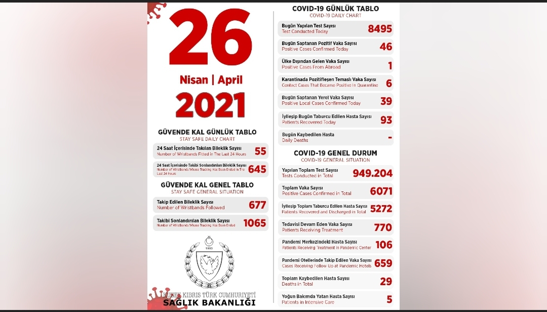 Son 24 saatte yapılan test sayısı 8495 olup, 39’u yerel 46 pozitif vakaya rastlanmış, 93 kişi taburcu edilmiştir.