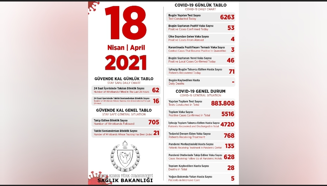 Son 24 saatte yapılan test sayısı 6263 olup, 46’sı yerel 53 pozitif vakaya rastlanmış, 71 kişi taburcu edilmiştir.