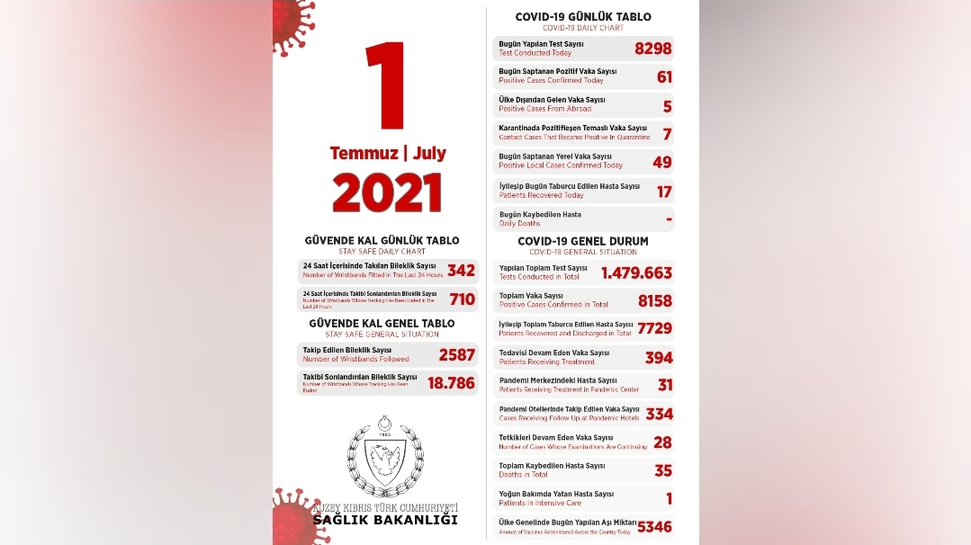 Son 24 saatte yapılan test sayısı 8298 olup, 49’u yerel 61 pozitif vakaya rastlanmış, 17 kişi taburcu edilmiştir.