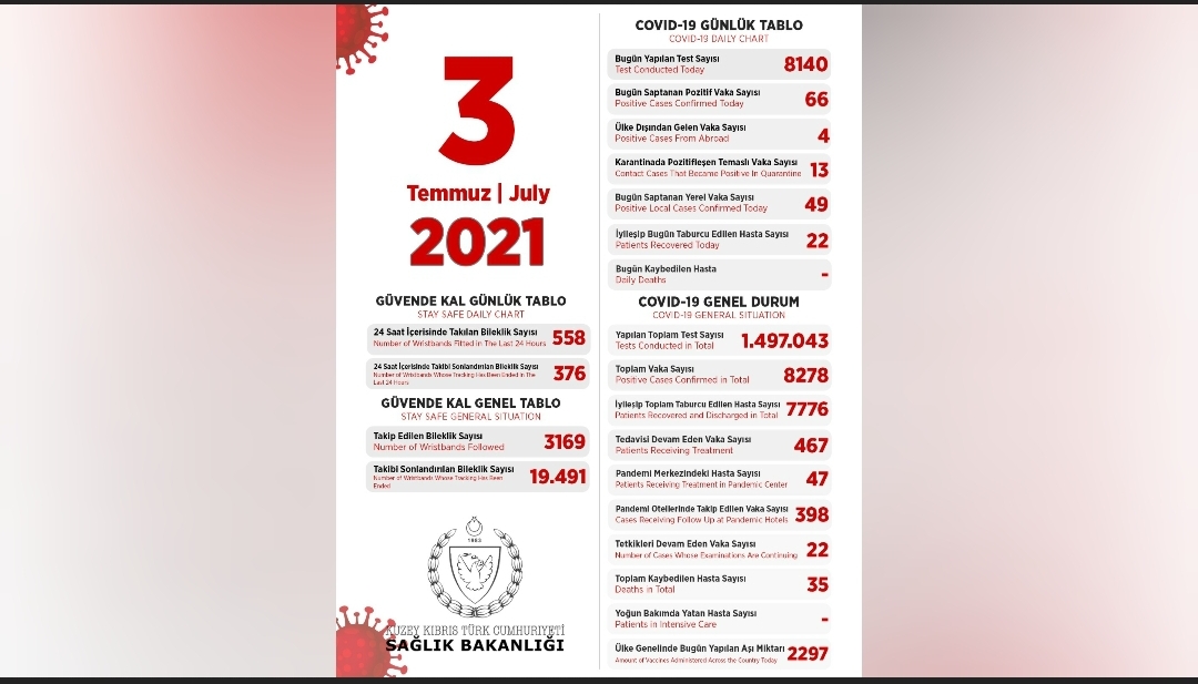 Son 24 saatte yapılan test sayısı 8140 olup, 49’u yerel 66 pozitif vakaya rastlanmış, 22 kişi taburcu edilmiştir.