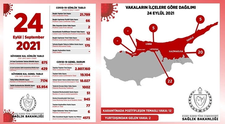 Son 24 saatte yapılan test sayısı 21.789 olup, 52”si yerel 66.pozitif vakaya rastlanmış, 175 kişi taburcu edilmiştir.