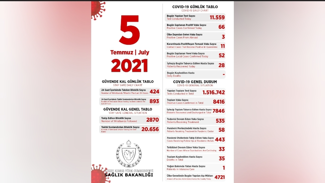 Son 24 saatte yapılan test sayısı 11.559 olup, 52’si yerel 66 pozitif vakaya rastlanmış, 28  kişi taburcu edilmiştir.