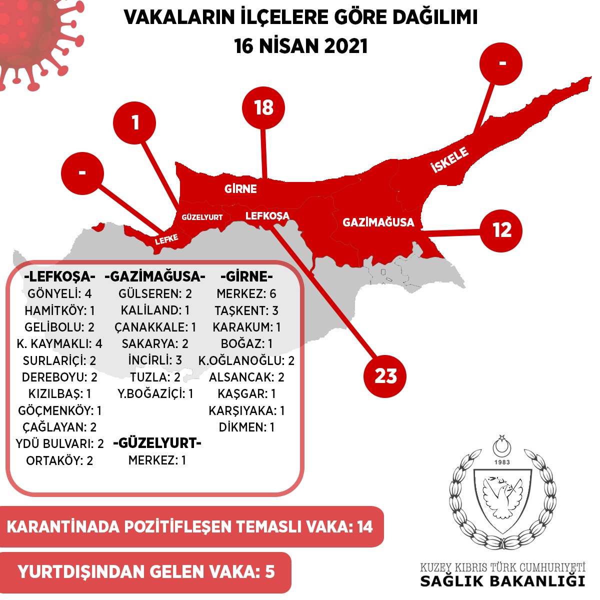 5 kişi hava yolu ile ülkemize gelmiştir. 14 kişi daha önce tespit edilen vakaların  temaslılarıdır ve bu süre içinde gözetim altında bulunmaktadırlar. 54 kişi ise yerel vakadır.