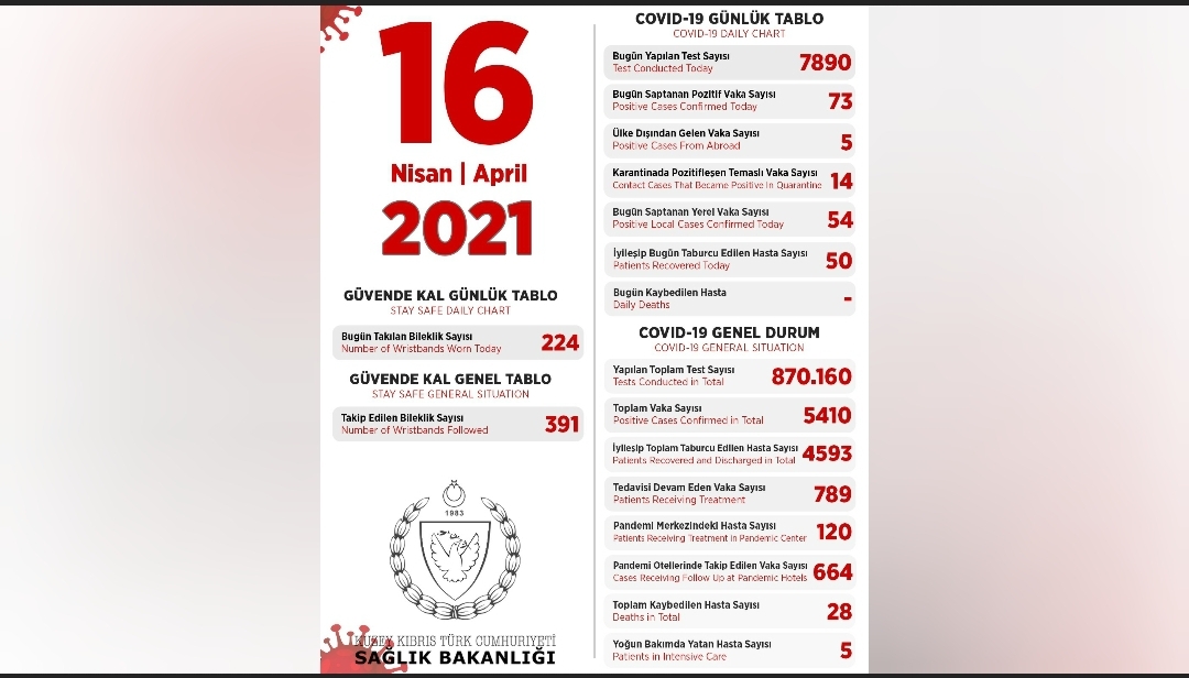 Son 24 saatte yapılan test sayısı 7890 olup, 54’ü yerel 73 pozitif vakaya rastlanmış, 50 kişi taburcu edilmiştir.