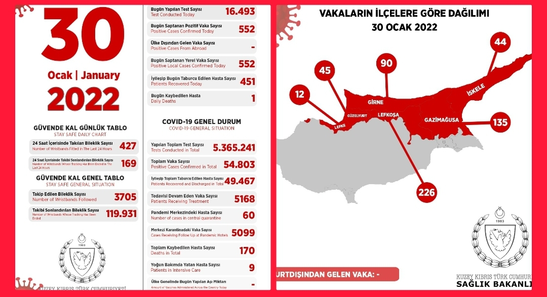 Τα 226 από τα τελευταία επιβεβαιωμένα κρούσματα είναι από την επαρχία Λεφκόσια, τα 90 στην Γκίρνε, 135 στην Γκαζίμαγουσα, τα 45 στην Γκιουζέλγιουρτ, τα 44 στην Ισκέλε και τα 12 στην Λέφκε.