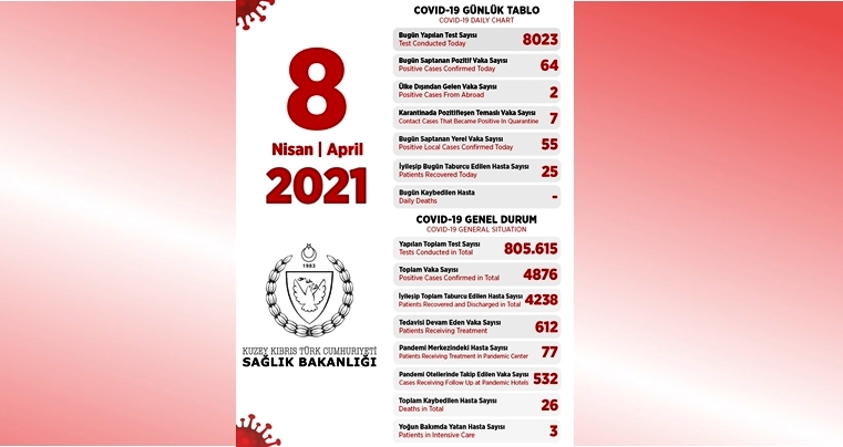 Son 24 saatte yapılan test sayısı 8023 olup, 55′ i yerel 64 pozitif vakaya rastlanmış, 25 kişi taburcu edilmiştir.