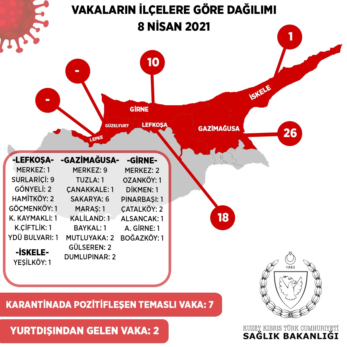 2 kişi yurt dışından hava yolu ile ülkemize gelmiştir. 7 kişi daha önce tespit edilen vakaların temaslılarıdır ve bu süre içinde gözetim altında bulunmaktadırlar. 55 kişi ise yerel vakadır.