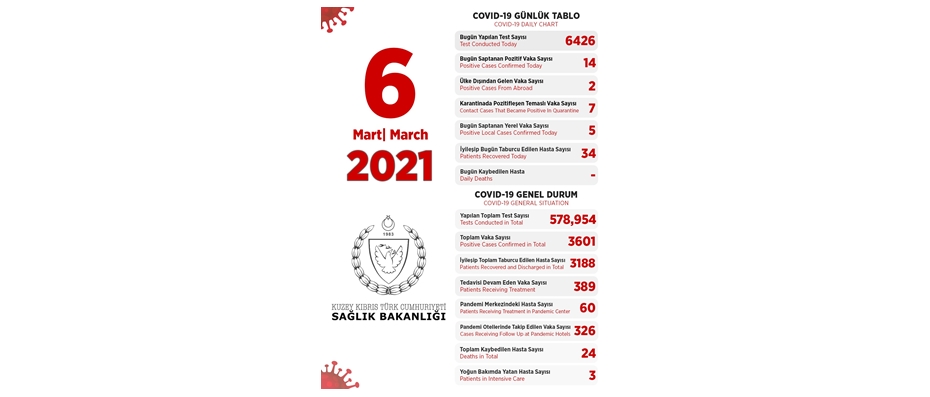 Sağlık Bakanlığı son 24 saatte yapılan test sayısı 6426 olup, 5’i yerel 14 pozitif vakaya rastlanmış, 34 kişi taburcu edildiğini açıkladı