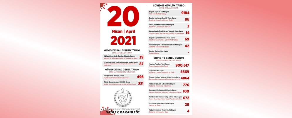 Son 24 saatte yapılan test sayısı 9184 olup, 69’u yerel 86 pozitif vakaya rastlanmış, 42 kişi taburcu edilmiştir.