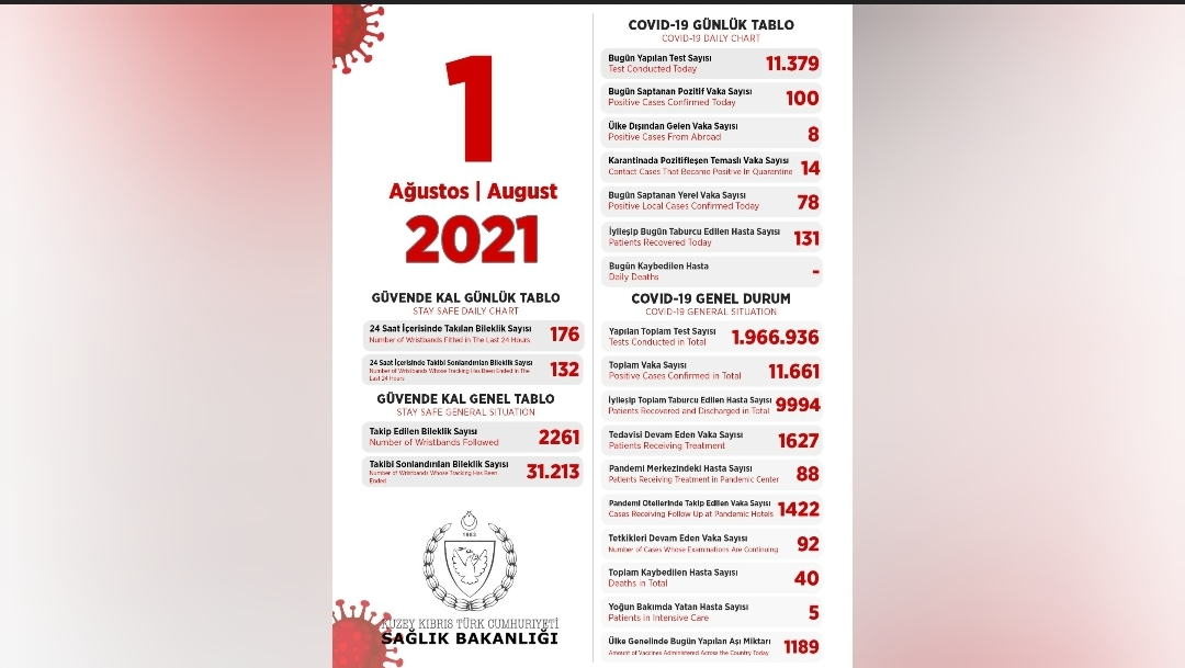 Son 24 saatte yapılan test sayısı 11.379 olup, 78’i yerel 100 pozitif vakaya rastlanmış, 131 kişi taburcu edilmiştir.
