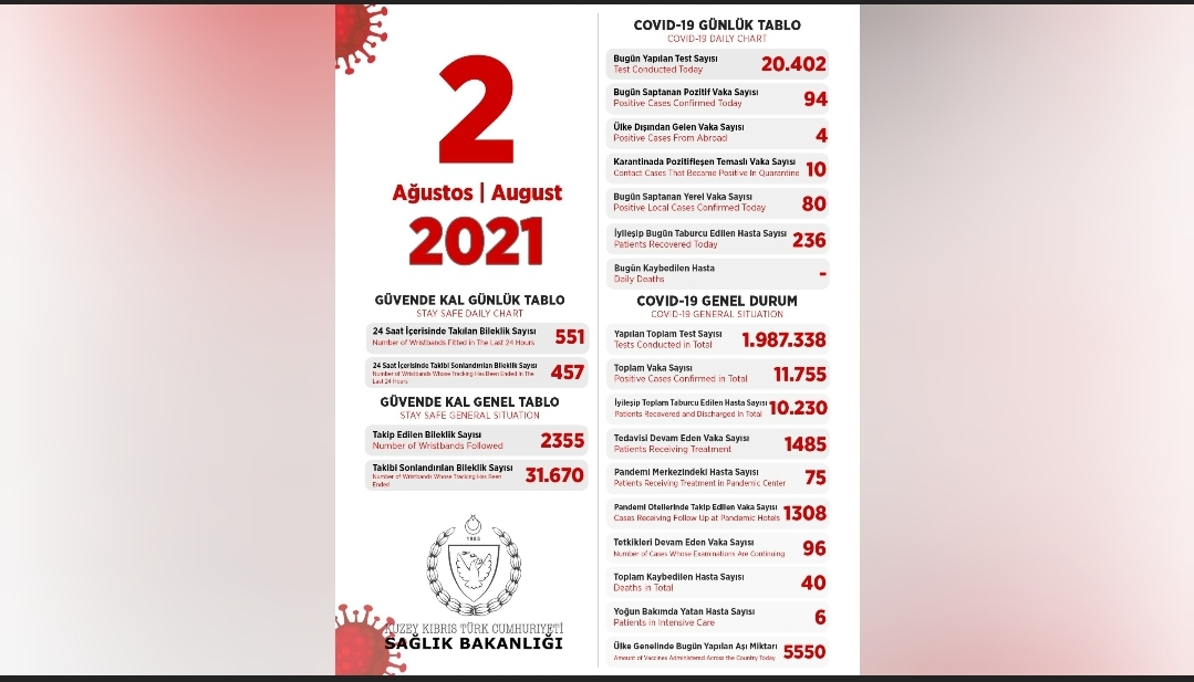 Son 24 saatte yapılan test sayısı 20.402 olup, 80’i yerel 94 pozitif vakaya rastlanmış, 236 kişi taburcu edilmiştir.