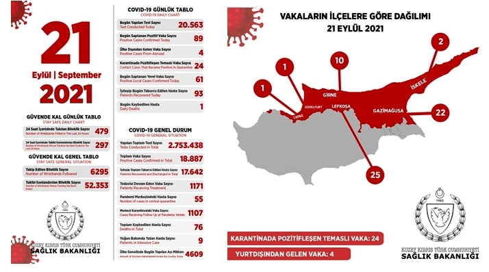 Σύμφωνα με ανακοίνωση του Υπουργείου Υγείας, το τελευταίο 24ωρο διενεργήθηκαν 20,563 τεστ και εντοπίστηκαν 89 κρούσματα, εκ των οποίων τα 61 είναι εγχώριες λοιμώξεις.