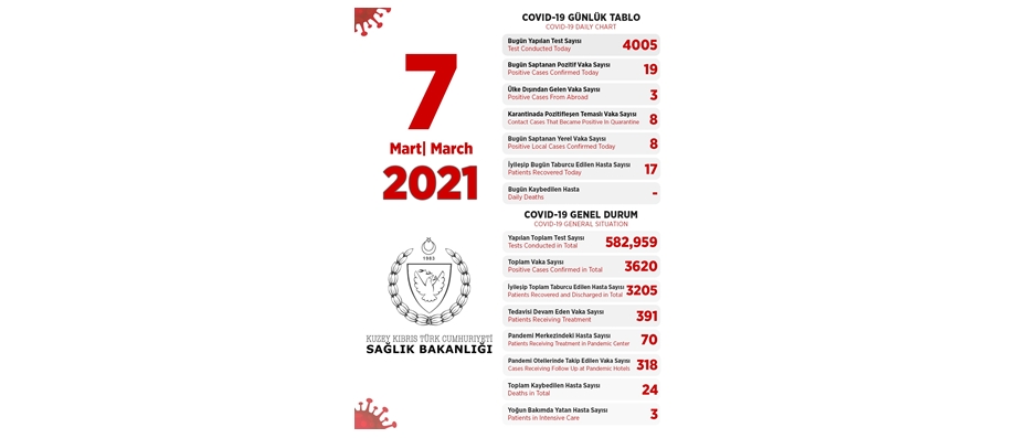 Sağlık Bakanlığı’ndan yapılan açıklamaya göre son 24 saatte yapılan test sayısı 4005 olup, 8’i yerel 19 pozitif vakaya rastlanmış, 17 kişi taburcu edildi.