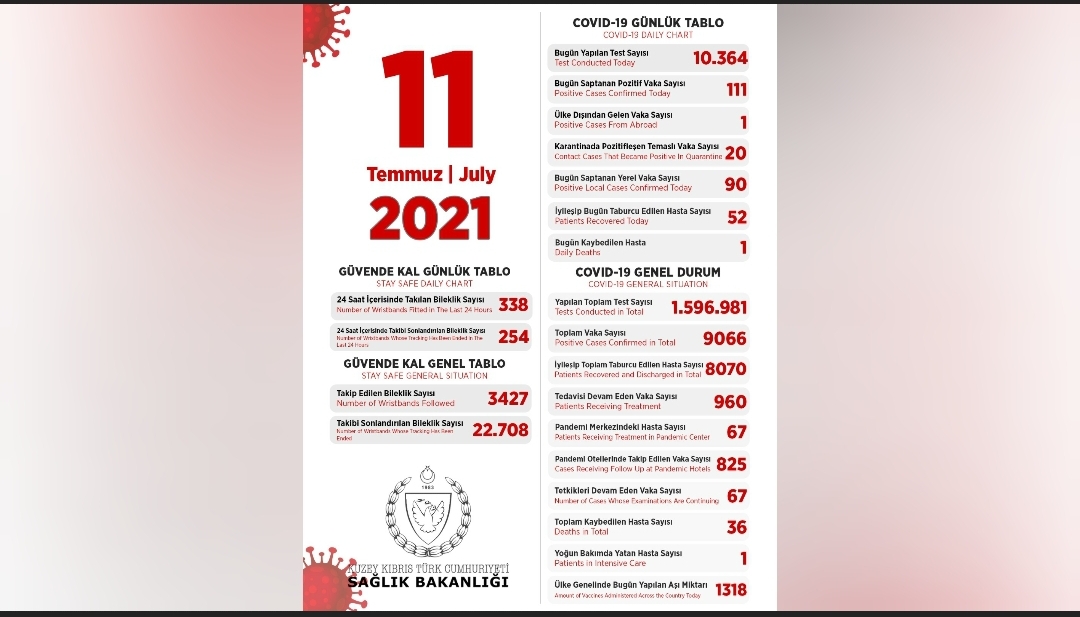 Son 24 saatte yapılan test sayısı 10.364 olup, 90’ı yerel 111 pozitif vakaya rastlanmış, 1 kişi hayatını kaybetmiş, 52 kişi taburcu edilmiştir.