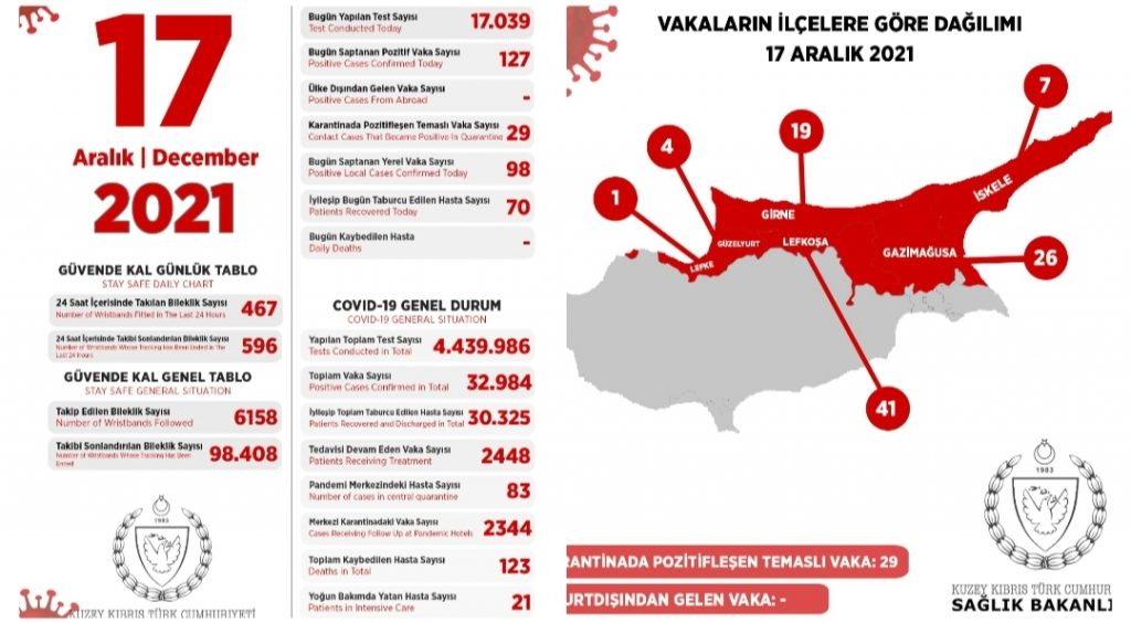 Son 24 saatte yapılan test sayısı 17.039 olup, 98’i yerel 127 pozitif vakaya rastlanmış, 70 kişi taburcu edilmiştir.