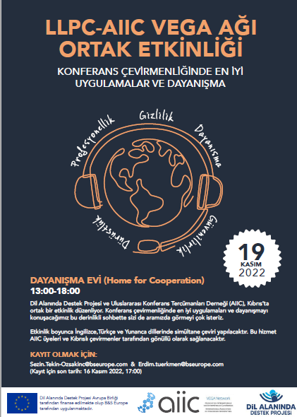 Avrupa Birliği tarafından finanse edilen Dil Alanında Destek Projesi (LLPC) ve Uluslararası Konferans Tercümanları Derneği (AIIC) Vega Ağı tarafından cumartesi günü “Konferans Çevirmenliğinde En İyi Uygulamalar ve Dayanışma” etkinliği düzenlenecek.