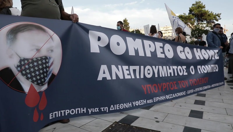 ABD’nin Selanik Konsolosluğu yakınında toplanan bir grup, Pomepo’nun Selanik’i ziyaretine tepki amacıyla “Savaş bakanı Pompeo evine git” şeklinde slogan atarak ABD bayrağını yaktı.