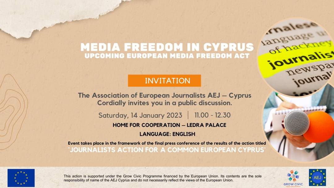 Avrupalı Gazeteciler Derneği (AEJ)-Kıbrıs, “Kıbrıs’ta Basın Özgürlüğü: Yaklaşan Avrupa Medya Özgürlüğü Yasası” konulu halka açık bir etkinlik düzenliyor.