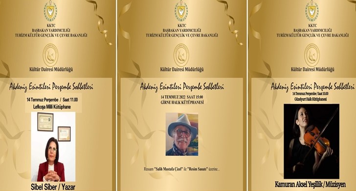 Bu haftaki Akdeniz Esintileri Perşembe Sohbetleri’nde Lefkoşa Milli Kütüphanesi saat 11.00’de Yazar kimliğiyle Sibel Siber’i; Gazimağusa Halk Kütüphanesi saat 14.00’de Sanatçı Umut Albayrak’ı; Girne Halk Kütüphanesi saat 15.00’de Ressam Salih Mustafa Çizel’i ve Güzelyurt Halk Kütüphanesi saat 10.00’da Müzisyen Kamuran Aksel Yeşillik’i konuk edecek.