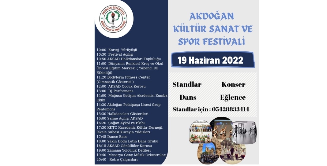 Kültür Dairesi’nden yapılan açıklamaya göre, Akdoğan Kültür, Sanat ve Spor Festivali kapsamında konserler, dans gösterileri, turnuvalar ve yarışmalar düzenlenecek. Akdoğan Belediye Parkı’nda, 19 Haziran Pazar günü 10.00 – 23.00 saatleri arasında yapılacak Festival’de çeşitli standlar da kurulacak.