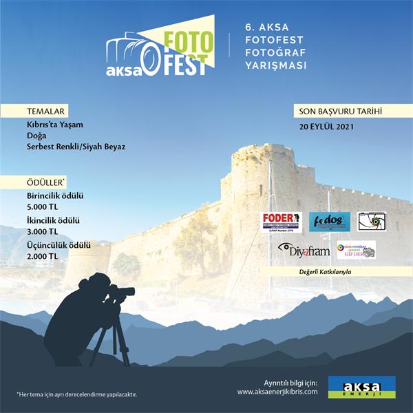 Bu yıl altıncısı düzenlenen Aksa Fotofest Fotoğraf Yarışması’na başvurular 20 Eylül’de son buluyor. Toplam 30 bin TL ödül verilecek Aksa Enerji sponsorluğundaki yarışmanın temaları ise “Kıbrıs’ta Yaşam”, “Doğa”, “Serbest Renkli / Siyah Beyaz” olarak belirlendi.