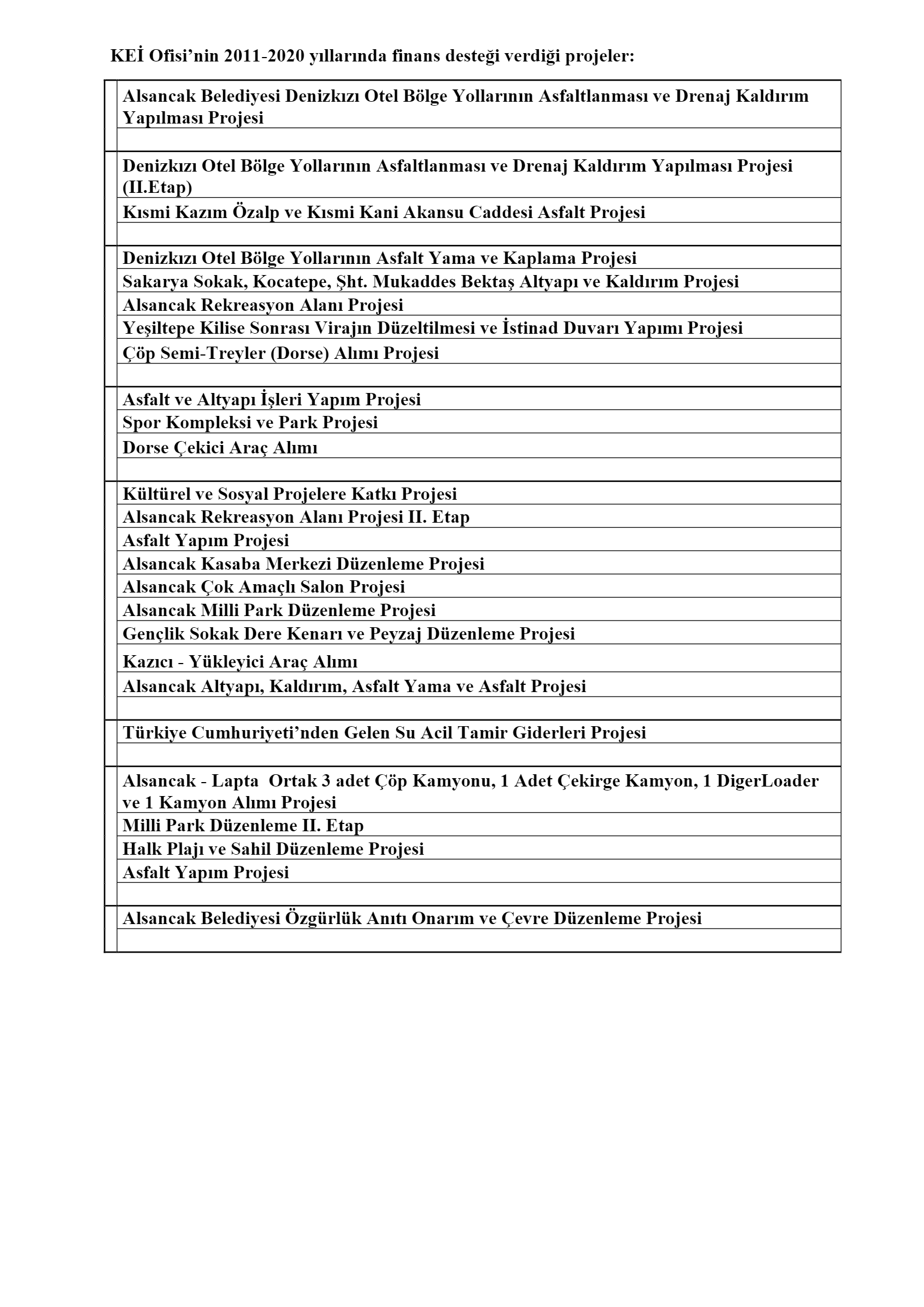 Yerel yönetimlerin hizmet kalitesini artırmak amacıyla çeşitli projelere finans ve ekipman desteği sağlayan KEİ Ofisi, bu kapsamda, belediyelerin altyapı yatırımlarını güçlendirme projeleri başta olmak üzere, kültür, sanat, spor, açık pazar yapımı ve restorasyon gibi çeşitli projelerine katkı veriyor.