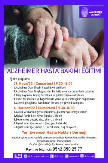 Alzheimer Derneği Başkanı İzlem Sönmez, derneğin hasta yakınları ve hastalara bakım verenler için konusunda deneyimli hemşireler eşliğinde Alzheimer hastalarının temel bakımına yönelik, hem teorik anlatımların hem de pratik uygulamaların aktarılacağı seminer düzenleyeceklerini bildirdi.