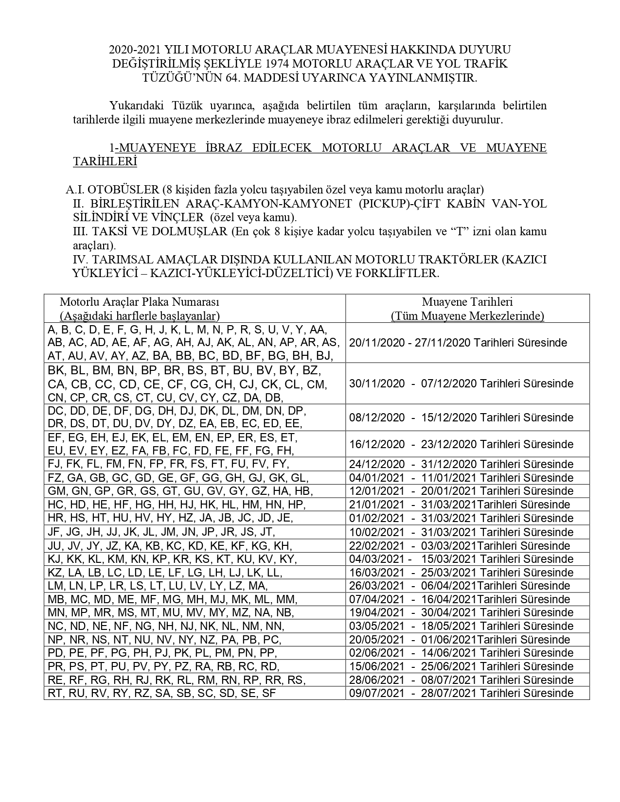 Yapılan yazılı açıklamada, 2020-2021 Yılı Motorlu Araçlar Muayene Listesi’nin, Bayındırlık ve Ulaştırma Bakanı ve Motorlu Araçlar Mukayyiti Resmiye Canaltay imzasıyla, 1974 Motorlu Araçlar ve yol trafik Tüzüğü’nün 64. Maddesi uyarınca, koroanvirüs salgını nedeniyle yeniden düzenlenerek yayımlandığı ifade edildi.