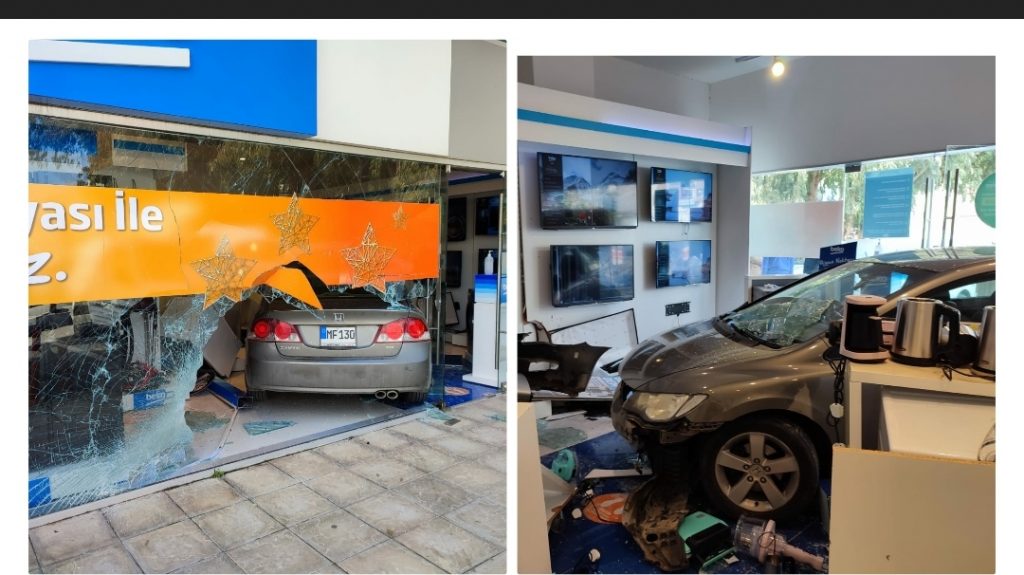 Polis Basın Subaylığı’ndan verilen bilgiye göre  bugün saat 11:30 sıralarında, Gazimağusa’da Sakarya Mahallesinde, Lemar AVM park alanı içerisinde, Mustafa Ersoy ÖZBİLEN (E-71), yönetimindeki MF 130 plakalı salon araç ile kuzey istikametine doğru seyrettiği sırada, direksiyon hakimiyetini kaybetmesi sonucu Beko Beyaz Eşya Mağazasının vitrin camına aracının ön kısmı ile çarpmıştır.