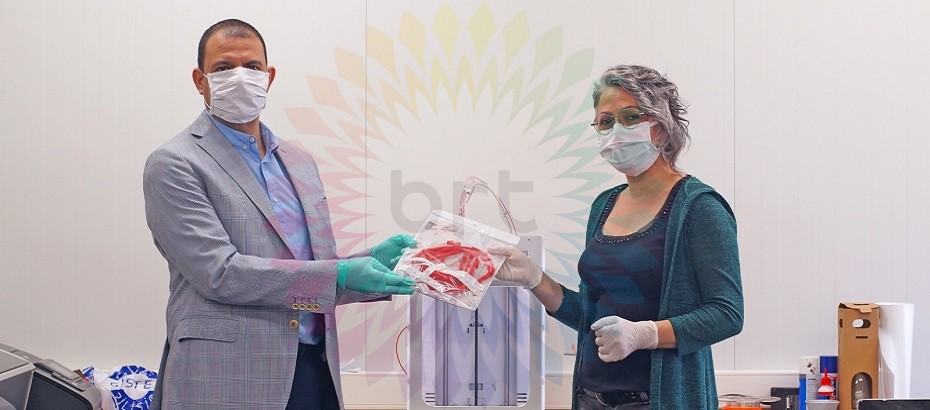 Üniversite bünyesinde çalışmalarını yürüten Innovation Hub Direktörü Tobia Repossi tarafından tasarlanan yüz siperliği ile seri üretime devam ettiklerini belirten Vehbi, siperliklerin ihtiyaç sahibi kurumlara ücretsiz dağıtılacağını söyledi.