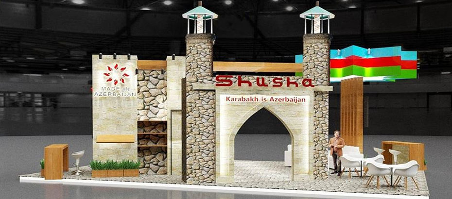 “Karabağ Azerbaycan’dır” standı, Karabağ’ın incisi sayılan Şuşa şehrindeki tarihi Yukarı Gövher Ağa Camisi şeklinde dizayn edildi.