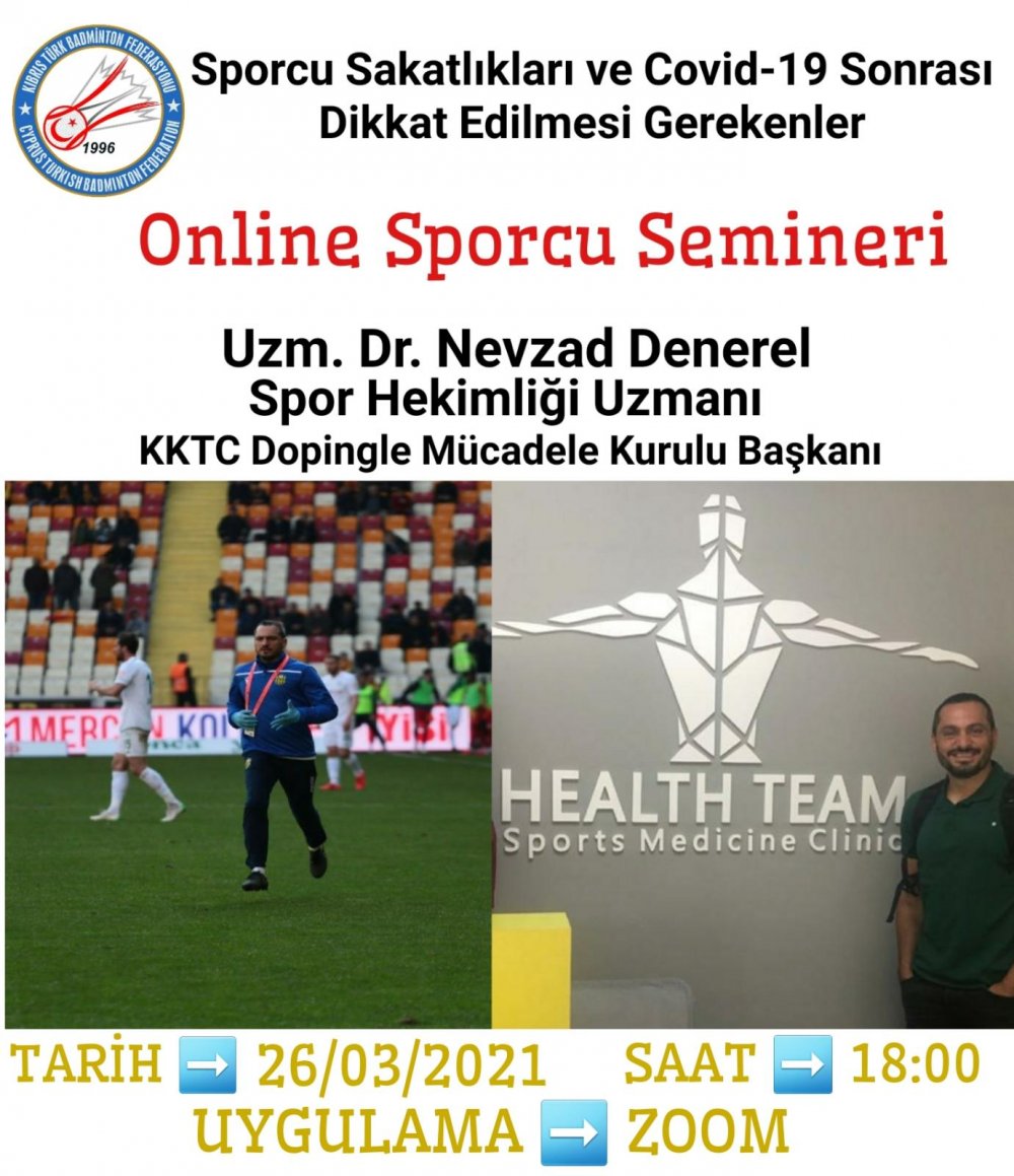 Badminton Federasyonu sporcular için düzenleyeceği sporcu sakatlıkları ve Cobid-19 sonrası nelere dikkat etmeleri gerektiği ile ilgili semineri KKTC Dopingle Mücadele Kurulu Başkanı, Spor Hekimi Uzmanı ve Uzm. Dr. Nevzat Denerel verecek.