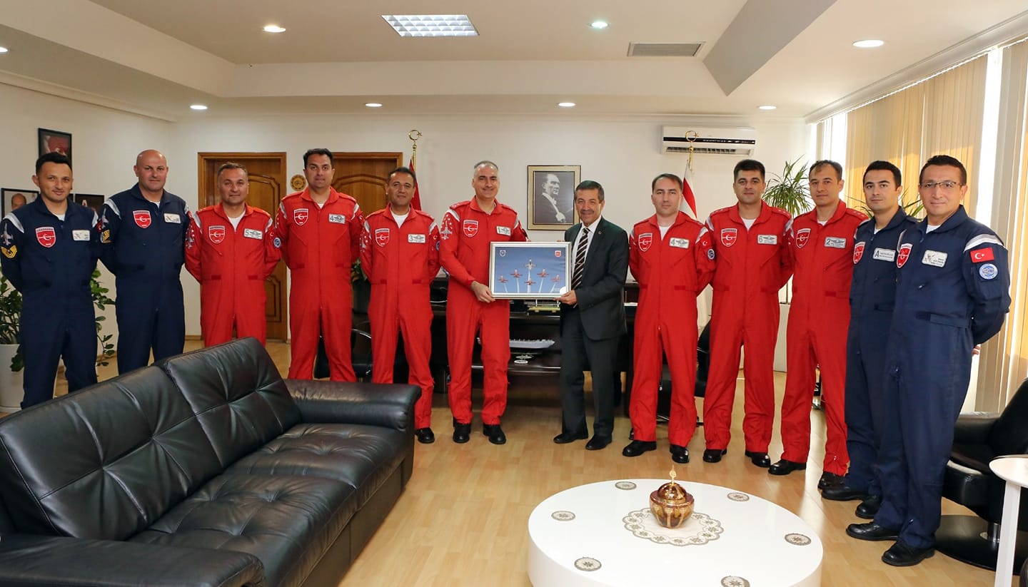 Bakan Ertuğruloğlu da Türk Yıldızlarına teşekkür ederek 20 Temmuz Barış ve Özgürlük Bayramı anısına plaket verdi ve başarılar diledi.