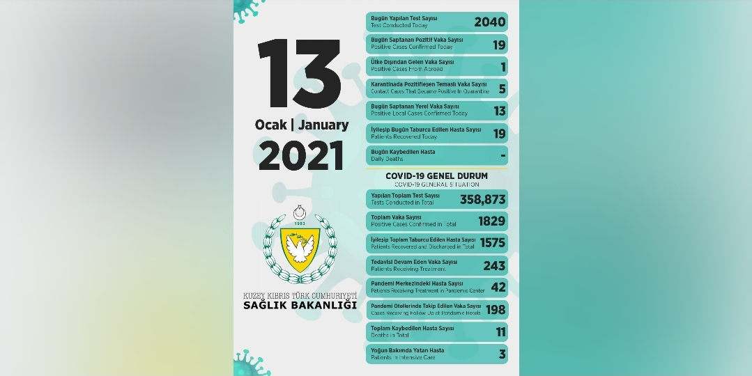 Sağlık Bakanı Dr. Ali Pilli, son 24 saatte yapılan test sayısının 2040 olduğunu, 13 yerel 19 pozitif vakaya rastlandığını, 2 kişinin yoğun bakıma alındığını, 19 kişinin taburcu edildiğini açıkladı.