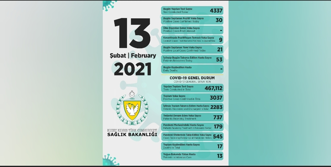 13 Şubat 2021 Covid-19 genel durumu şöyle:
