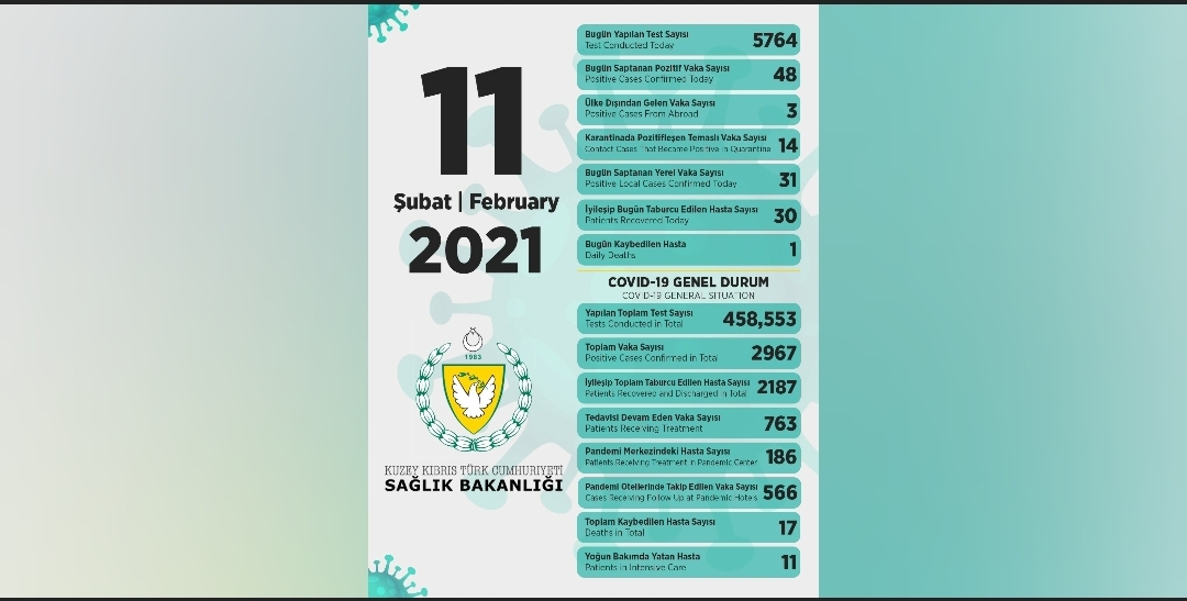 Sağlık Bakanı Dr. Ali Pilli, son 24 saatte yapılan test sayısının 5764 olduğunu, 31’i yerel 48 pozitif vakaya rastlandığını , 1kişinin hayatını kaybettiğini, 30 kişinin taburcu edildiğini açıkladı.