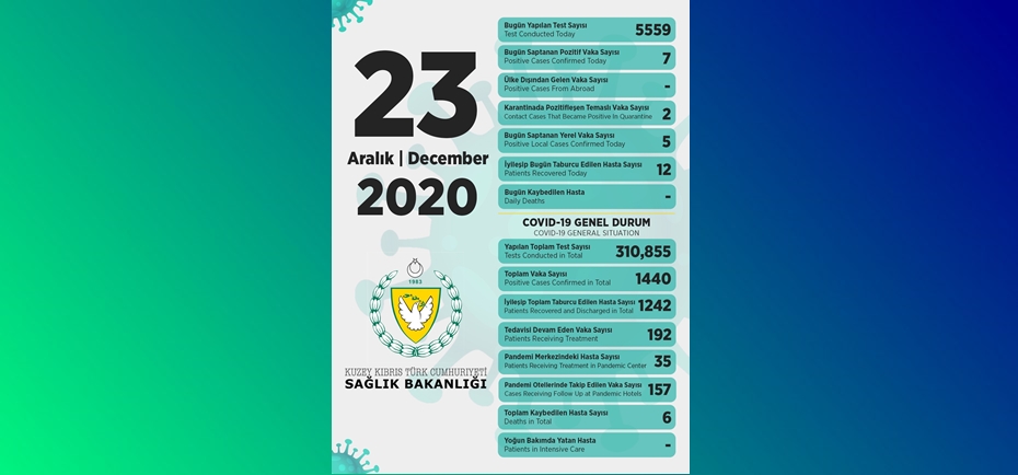 Sağlık Bakanı Dr. Ali Pilli, son 24 saatte yapılan test sayısının 5559 olduğunu, 7 pozitif vakaya rastlandığını, 12 kişinin taburcu edildiğini açıkladı.