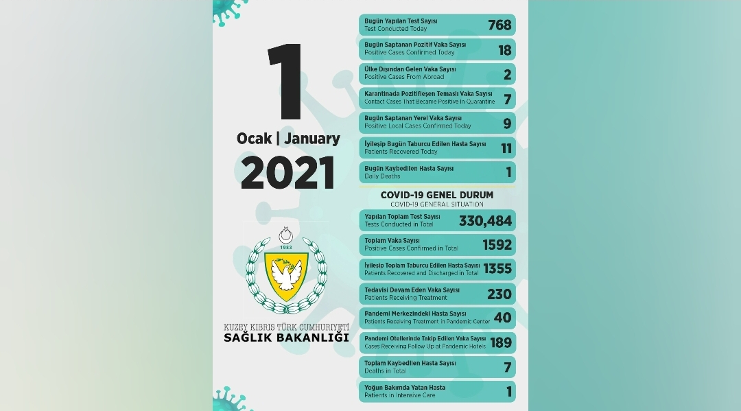 Sağlık Bakanı Dr. Ali Pilli, son 24 saatte yapılan test sayısının 768 olduğunu, 9’u yerel 18 pozitif vakaya rastlandığını, 1kişinin hayatını kaybettiğini, 1 kişinin yoğun bakıma alındığını, 11 kişinin taburcu edildiğini açıkladı.