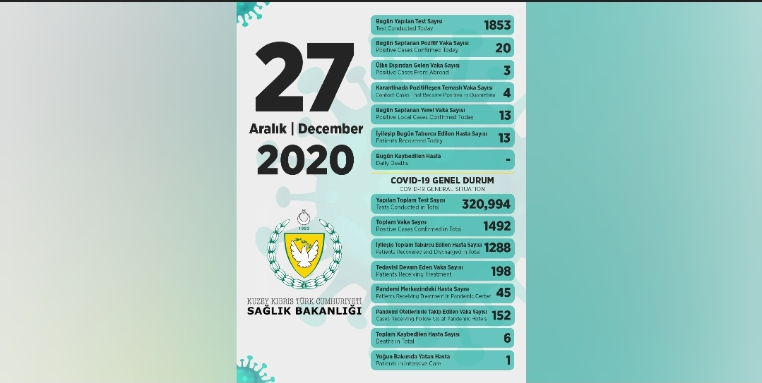 Sağlık Bakanı Dr. Ali Pilli, son 24 saatte yapılan test sayısının 1853 olduğunu, 13’ü yerel 20 pozitif vakaya rastlandığını, 13 kişinin taburcu edildiğini, 1 kişinin yoğun bakıma alındığını açıkladı.