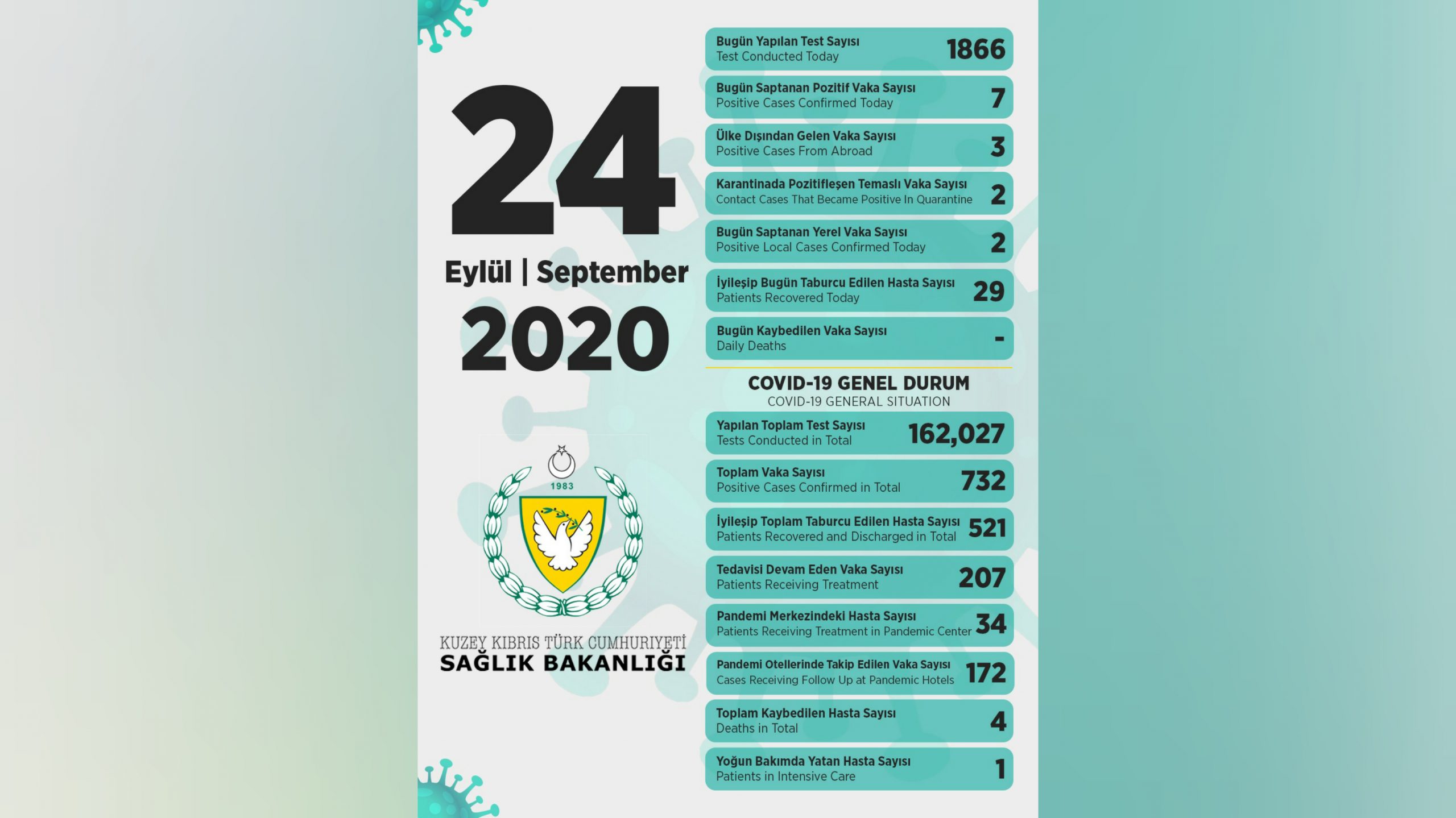 24 Eylül 2020 Covid-19 genel durumu şöyle;