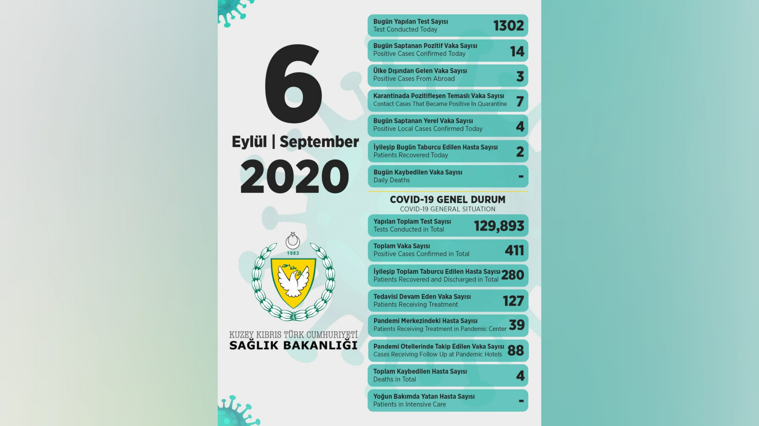6 Eylül 2020 Covid-19 genel durumu şöyle;