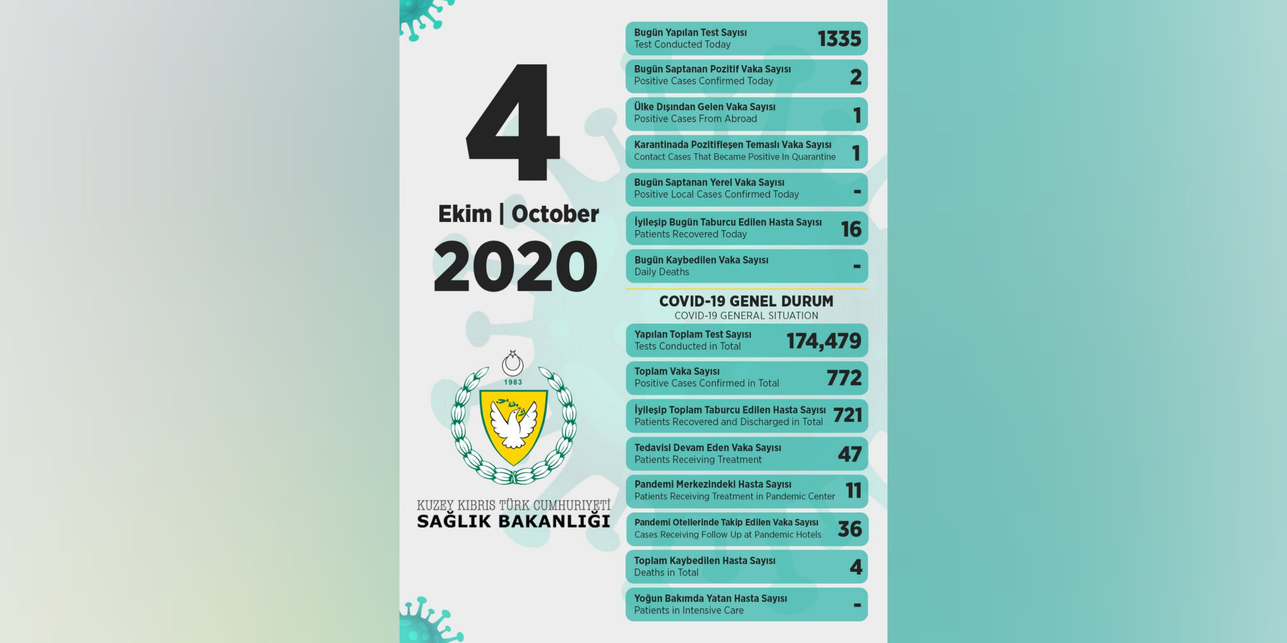 Sağlık Bakanı Dr. Ali Pilli, son 24 saatte yapılan test sayısının 1335 olduğunu, 2 pozitif vakaya rastlandığını , 16 kişinin taburcu edildiğini açıkladı.