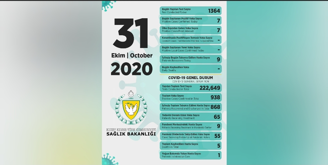 Sağlık Bakanı Dr. Ali Pilli, son 24 saatte yapılan test sayısının 1364 olduğunu, 7 pozitif vakaya rastlandığını, 9 kişinin taburcu edildiğini açıkladı.
