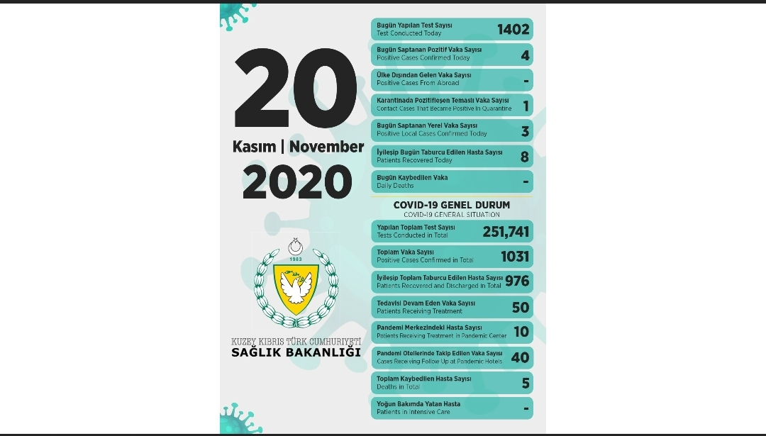 Sağlık Bakanı Dr. Ali Pilli, son 24 saatte yapılan test sayısının 1402 olduğunu, 4 pozitif vakaya rastlandığını, 8 kişinin taburcu edildiğini açıkladı.