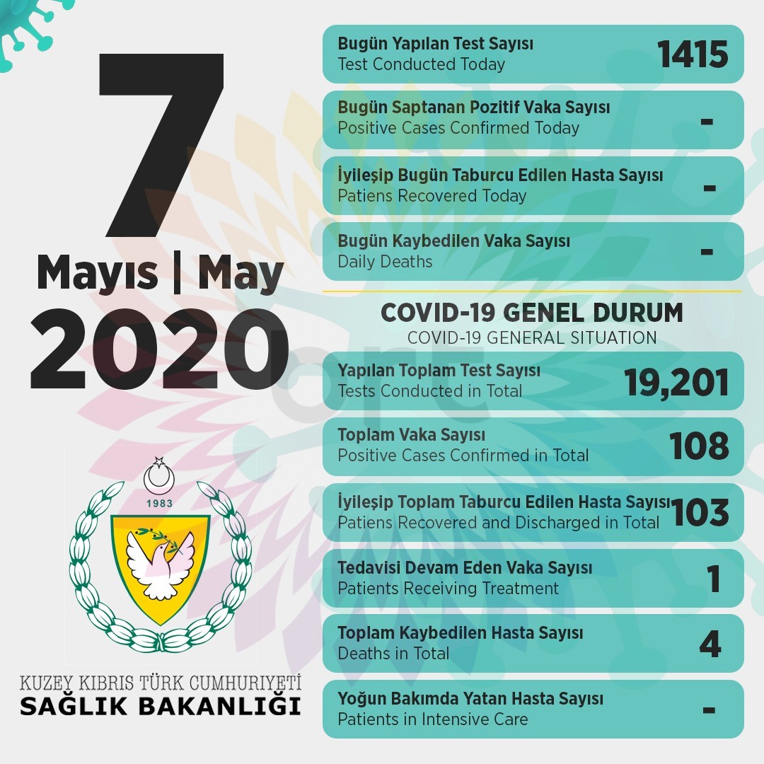 Sağlık Bakanı Dr Ali Pilli, son 24 saatte yapılan test sayısının 1415 olduğunu, pozitif bir vakaya rastlanmadığını açıkladı.