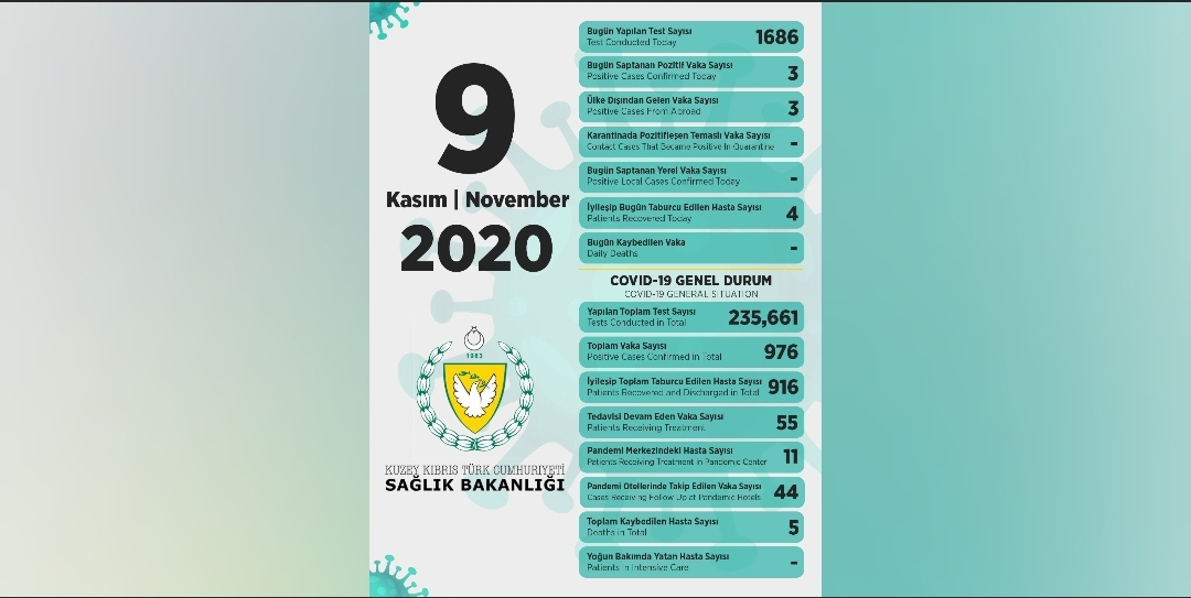 Sağlık Bakanı Dr. Ali Pilli, son 24 saatte yapılan test sayısının 1686 olduğunu, 3 pozitif vakaya rastlandığını , 4 kişinin taburcu edildiğini açıkladı.