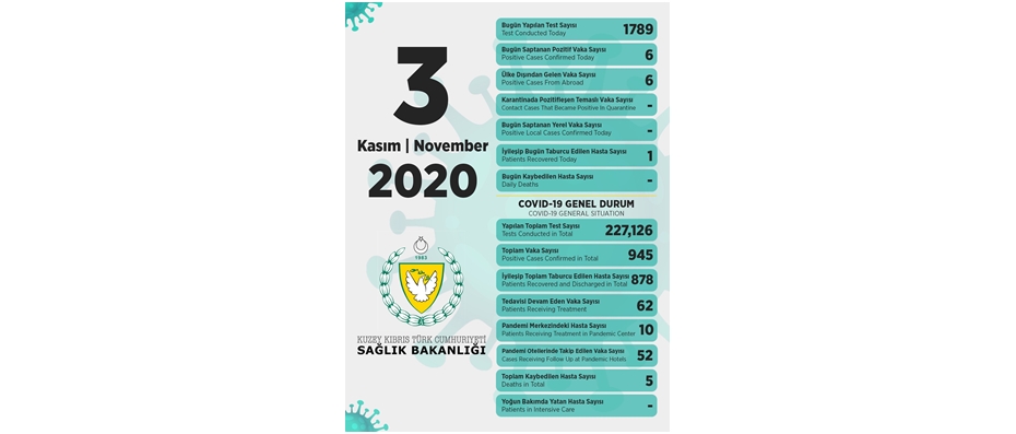 Sağlık Bakanı Dr. Ali Pilli, son 24 saatte yapılan test sayısının 1789 olduğunu, 6 pozitif vakaya rastlandığını , 1kişinin taburcu edildiğini, yoğun bakımda tedavi gören vakanın servise alındığını, şu anda yoğun bakımda herhangi bir vakanın olmadığını belirtti.